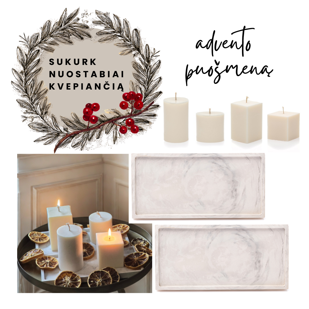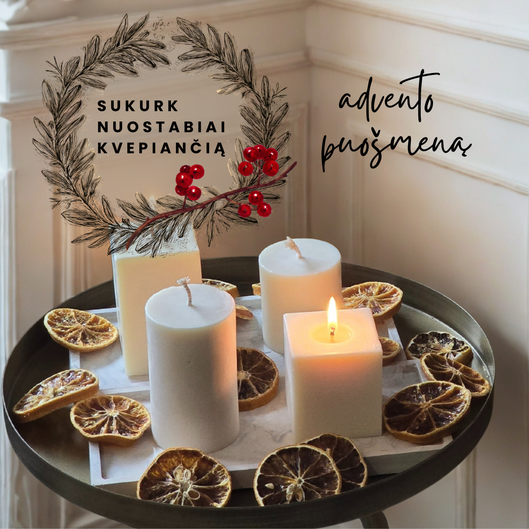 Sukurkite nuostabiai kvepiančią advento puošmeną, natūralaus rapsų vaško žvakės užpildys namus jaukiais kvapais bei šiltu žvakių šviesos mirgėjimu. Rinkinys skirtas Jūsų erdvių jaukumui ar šventinio stalo dekorui.